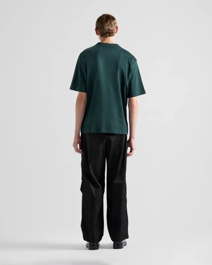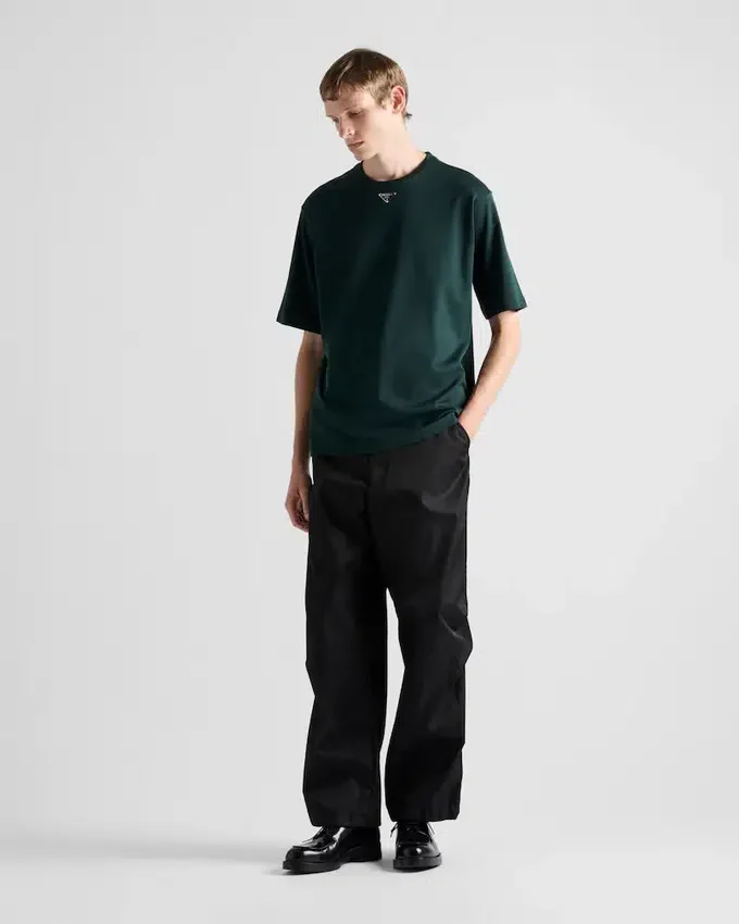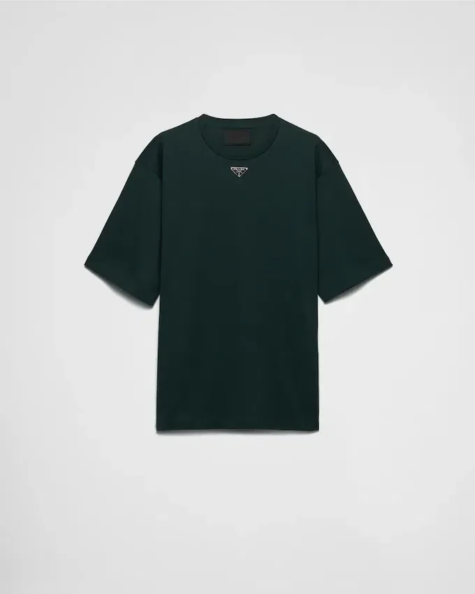 This Short-Sleeved Cotton Tee with Ribbed Knit Crew Neck Has an Oversized Fit. The Garment is Decorated with the Iconic Enameled Metal Triangle Logo on the Front.
