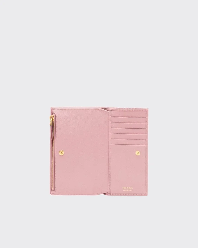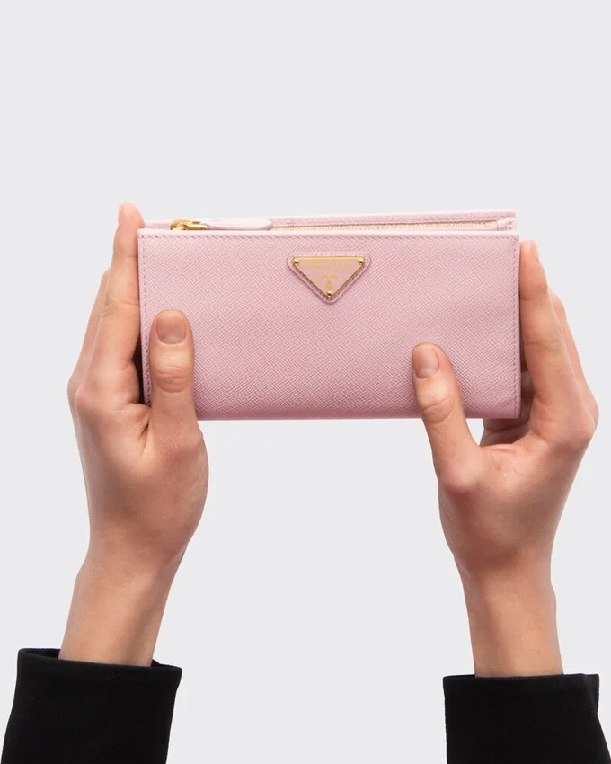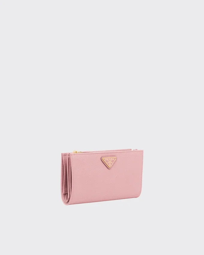 Sleek Lines Distinguish This Wallet in Iconic Saffiano Leather. The Accessory with Snap Closure and Metal Triangle Logo Has Pockets and Slots Inside.