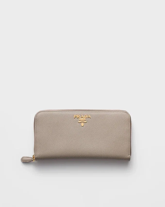 This Zipper Wallet is Made of Saffiano, an Iconic Prada Material: Calf Leather of the Highest Quality, Defined by a Crosshatch Texture and a Waxed Finish. The Lettering Logo Decorates the Accessory.