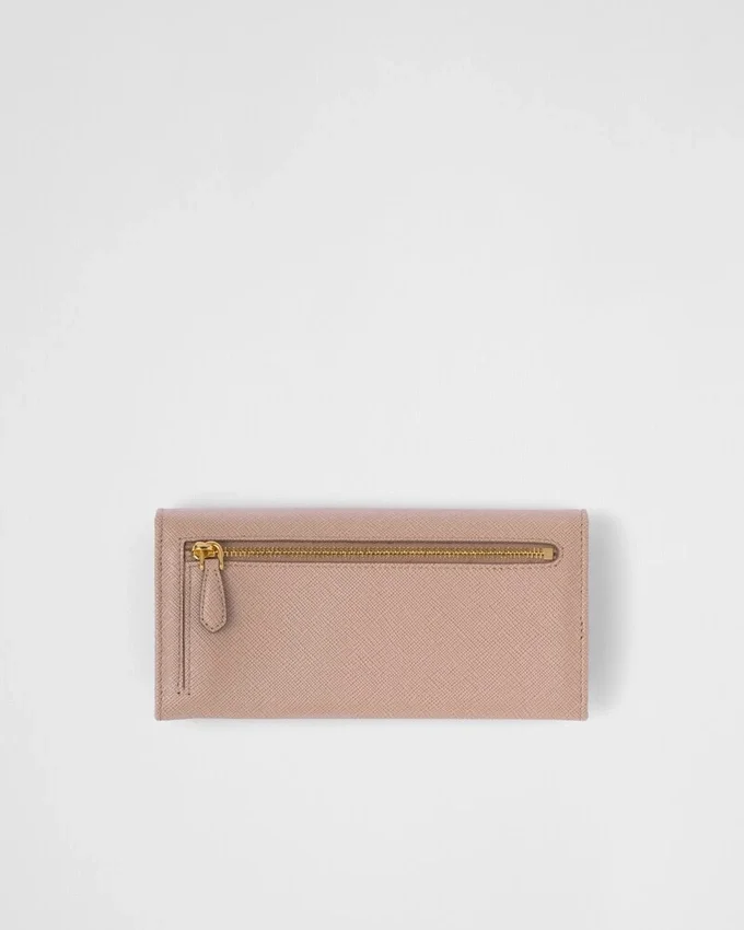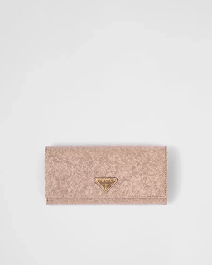 Decorated with the Triangle Prada Logo, This Flap Wallet is Crafted in Saffiano Leather. The Snap Closure Opens to Various Card Slots and Pockets.