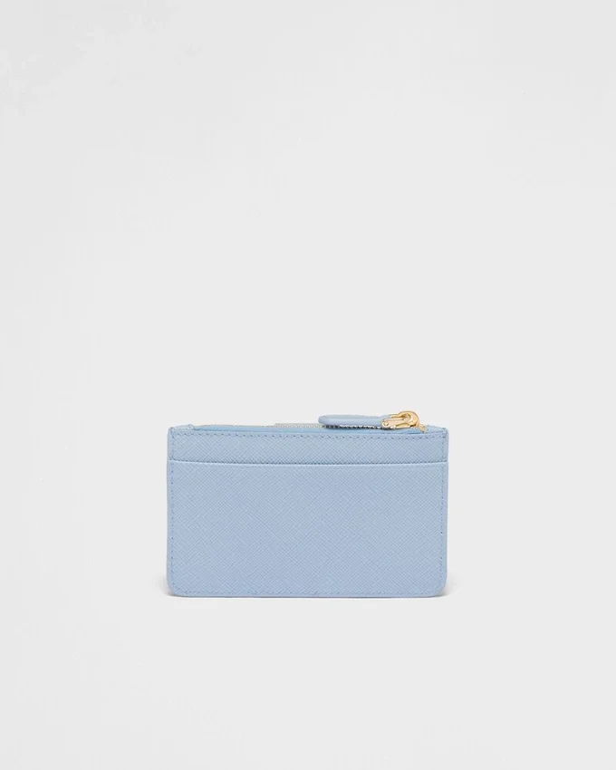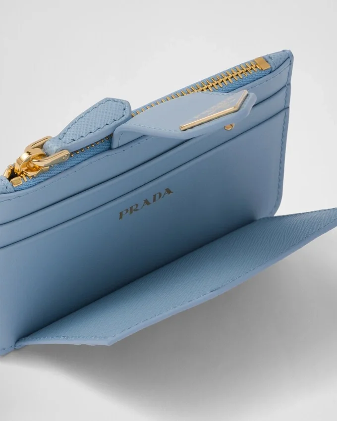 This Sophisticated Card Holder with Precious Allure Presents a Mix of Details in Smooth and Saffiano Leather, an Iconic Prada Material with a Crosshatch Texture. The Accessory Characterized by Its Minimalist Design is Embellished with the Iconic Enameled Triangle Logo of the Brand.