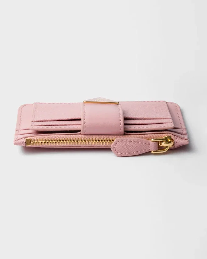 This Sophisticated Card Holder with Precious Allure Presents a Mix of Details in Smooth and Saffiano Leather, an Iconic Prada Material with a Crosshatch Texture. The Accessory Characterized by Its Minimalist Design is Embellished with the Iconic Enameled Triangle Logo of the Brand.