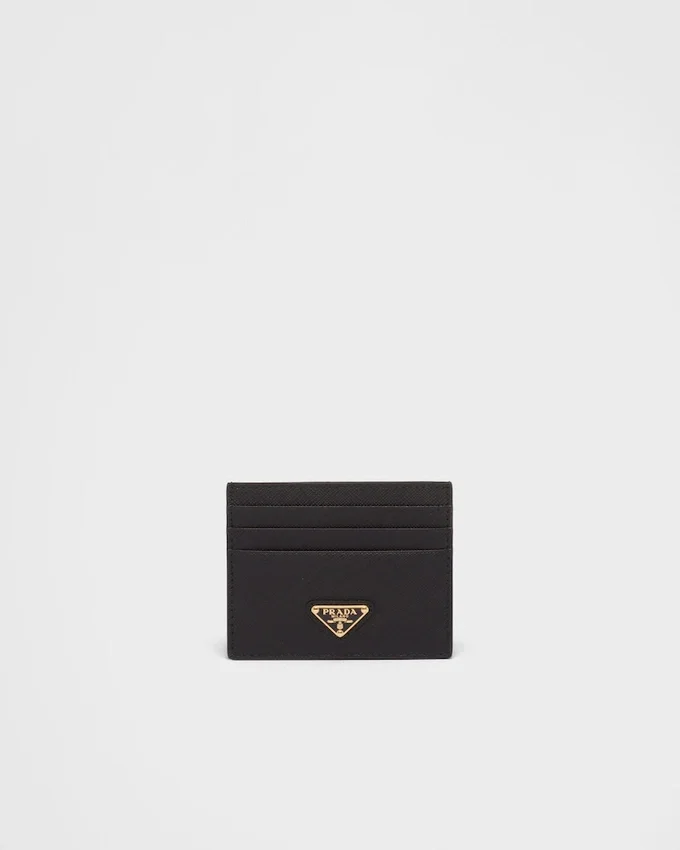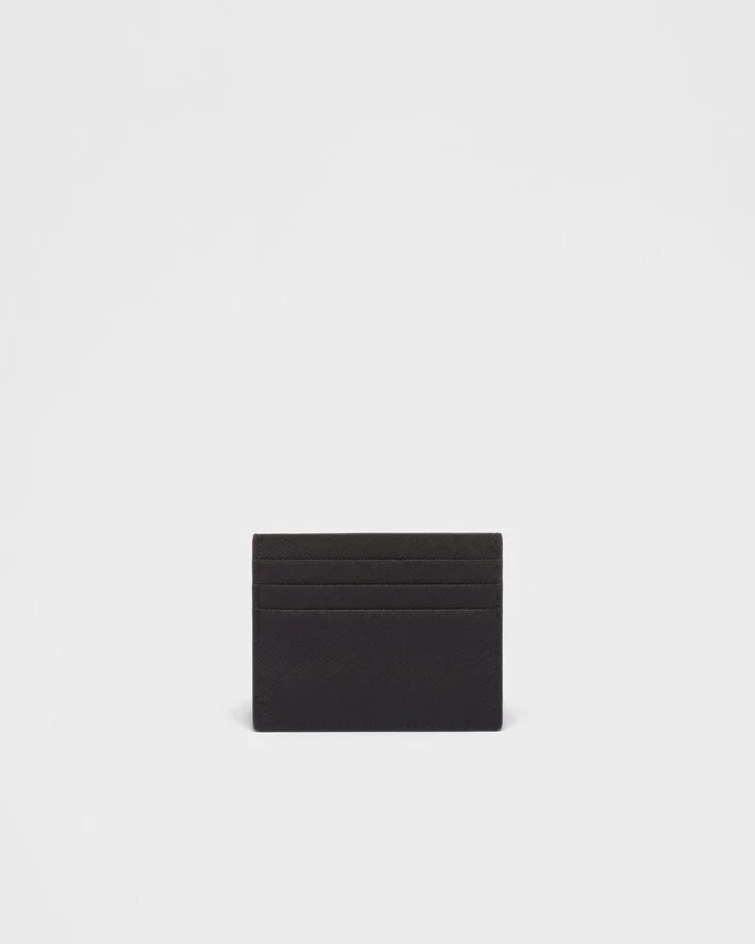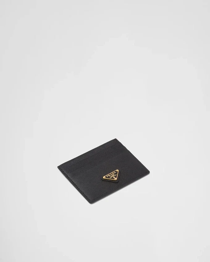 The Unmistakable Texture of Saffiano Leather Characterizes This Sleek Card Holder. The Accessory with Six Card Slots is Decorated with a Tonal Enameled Metal Triangle Logo.