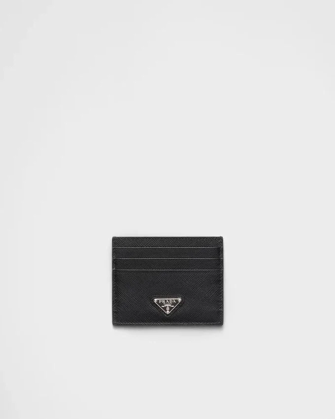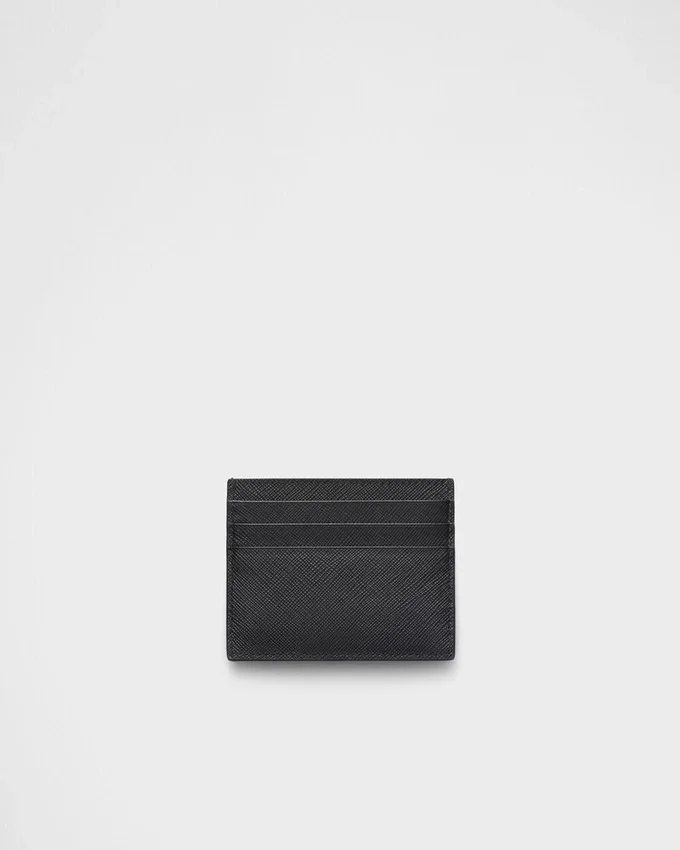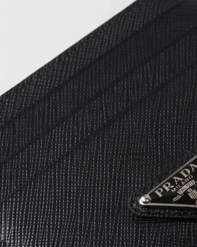 The Unmistakable Texture of Saffiano Leather Characterizes This Sleek Card Holder. The Accessory with Six Card Slots is Decorated with a Tonal Enameled Metal Triangle Logo.