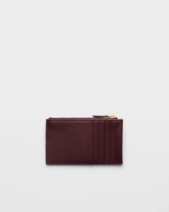 The Distinctive Crosshatch Texture of the Brand’s Iconic Saffiano Leather Characterizes This Card Holder with Sleek Lines. The Accessory with Five Card Slots is Decorated with the Metal Triangle Logo.