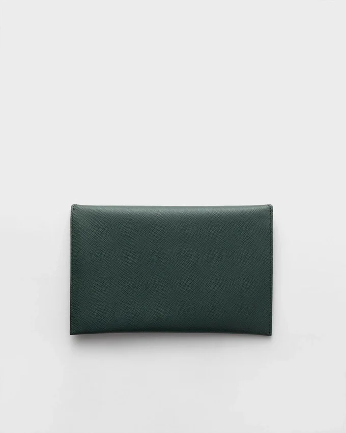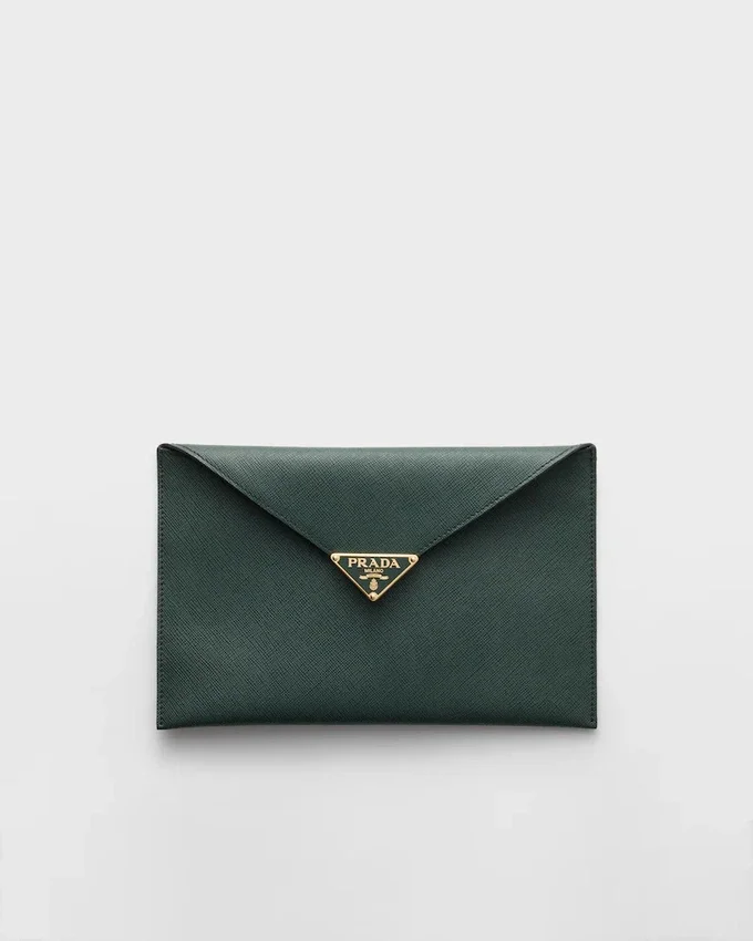 This Sophisticated and Functional Envelope Clutch in Saffiano Leather Has a Sleek Design. The Accessory with Card Slots is Decorated with the Enameled Metal Triangle Logo.