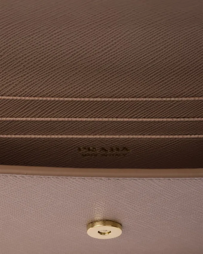 Saffiano Leather, an Emblematic Material of Prada Collections, Stands out for Its Crosshatch Pattern with Waxed Finish That Gives Each Design Versatile, Elegant Charm. This Mini-Bag Has a Sleek Yet Refined Geometric Shape, Illuminated by the Metal Hardware and Decorated with the Iconic Enameled Metal Triangle Logo.