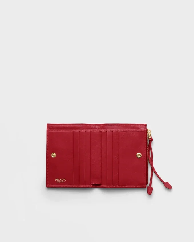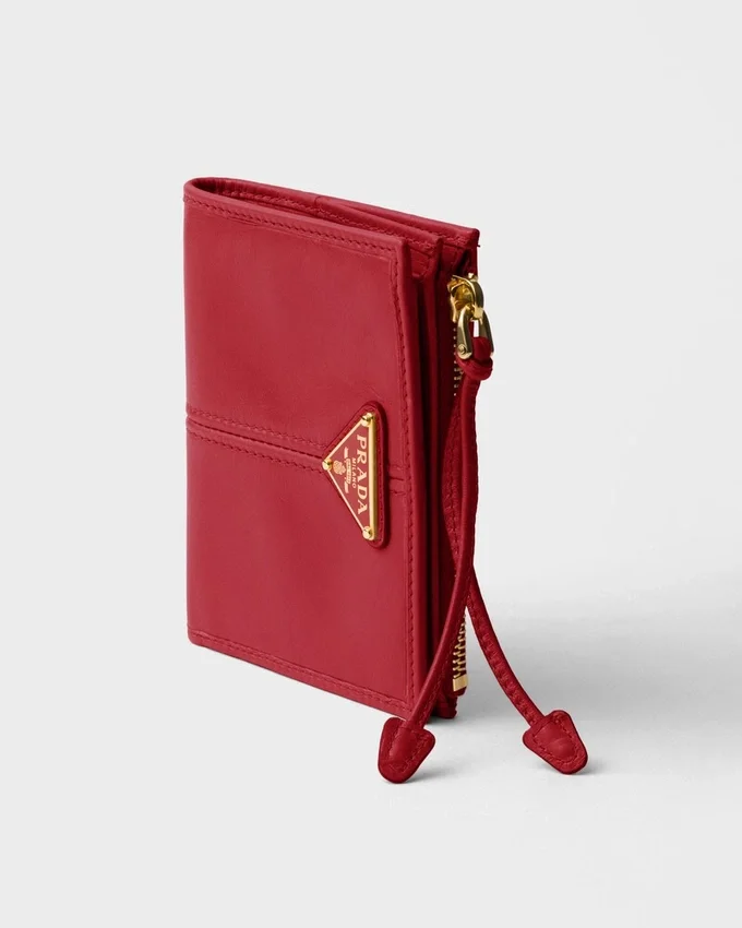 The Elegance of Leather and the Iconic Touch of the Enamelled Metal Triangle Logo Adorn This Refined Small Wallet. The Combination of Internal Compartments and Functional Details Completes the Design.