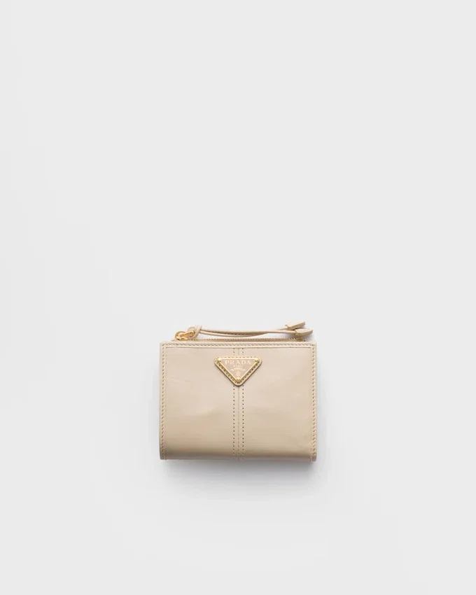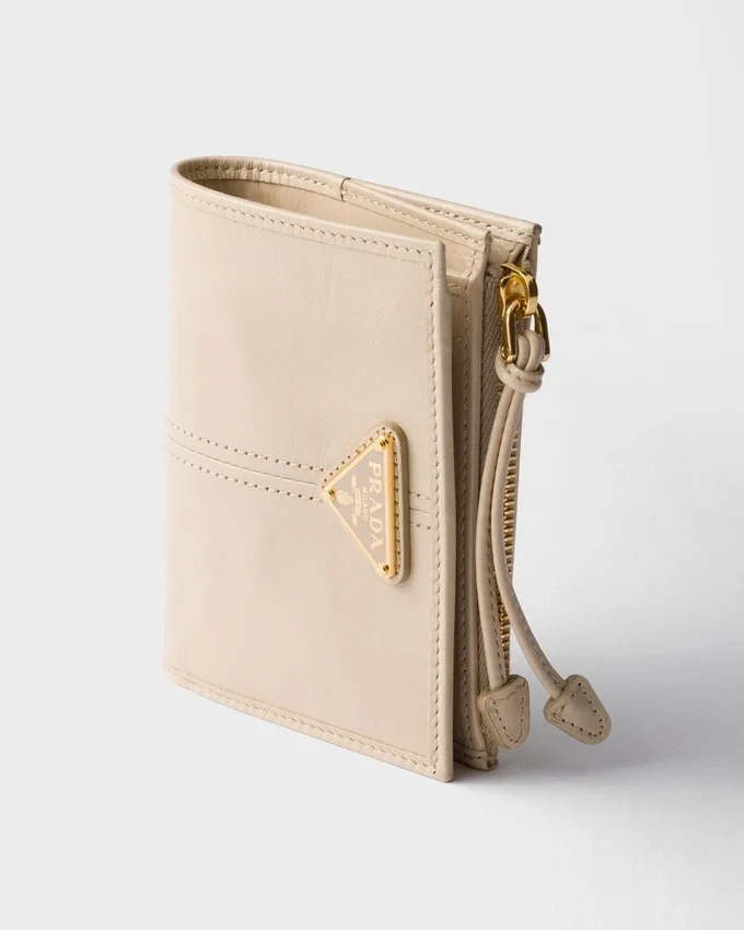 The Elegance of Leather and the Iconic Touch of the Enamelled Metal Triangle Logo Adorn This Refined Small Wallet. The Combination of Internal Compartments and Functional Details Completes the Design.