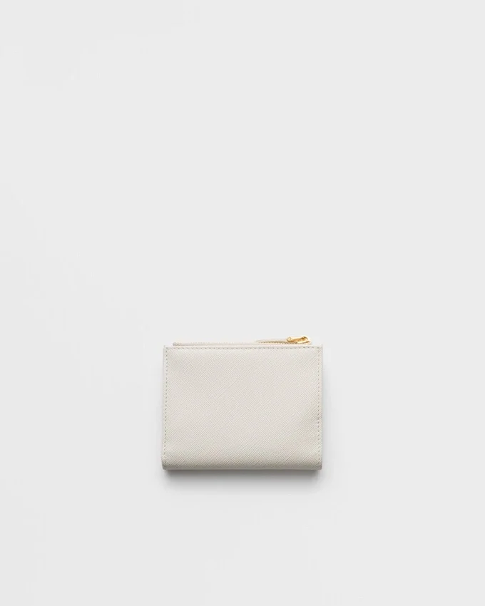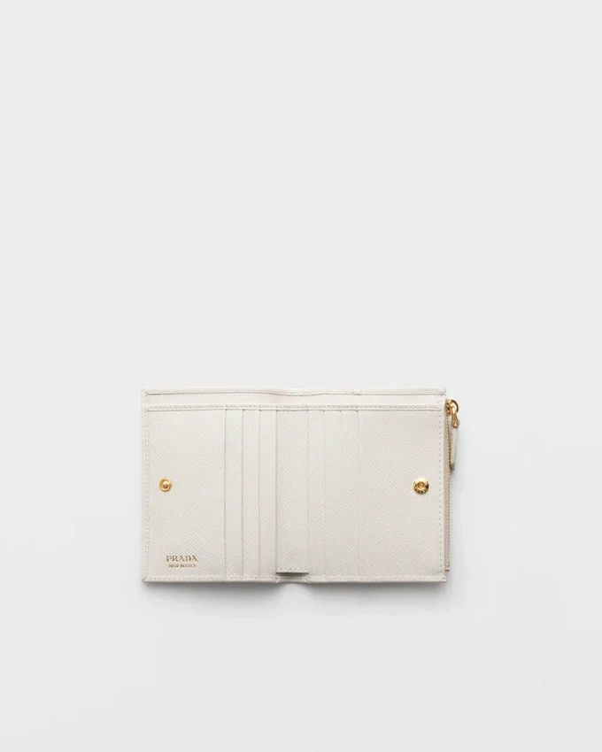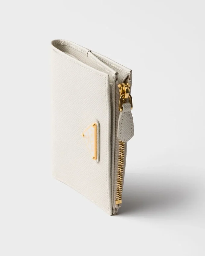 This Saffiano Leather Wallet with Enameled Metal Triangle Logo is Sleek and Elegant. The Accessory with Clean Lines Has a Zipper Coin Compartment, Bill Compartment, and Card Slots.