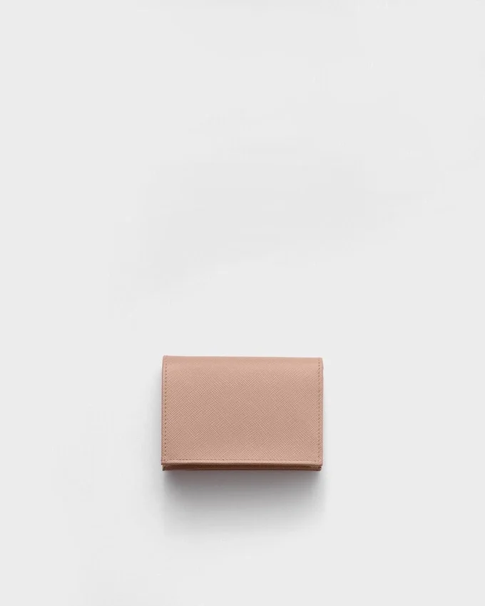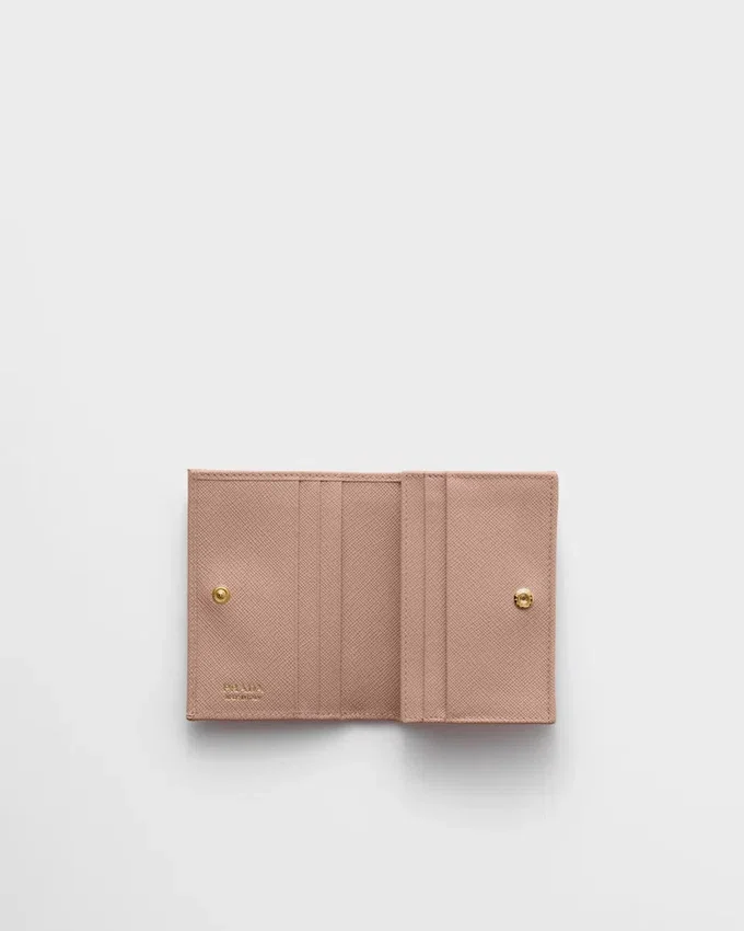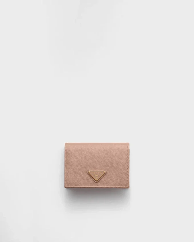 This Saffiano Leather Wallet with Enameled Metal Triangle Logo Expresses Sleek Elegance. The Accessory with Clean Lines Has a Zipper Coin Compartment, Bill Compartment, and Four Card Slots.