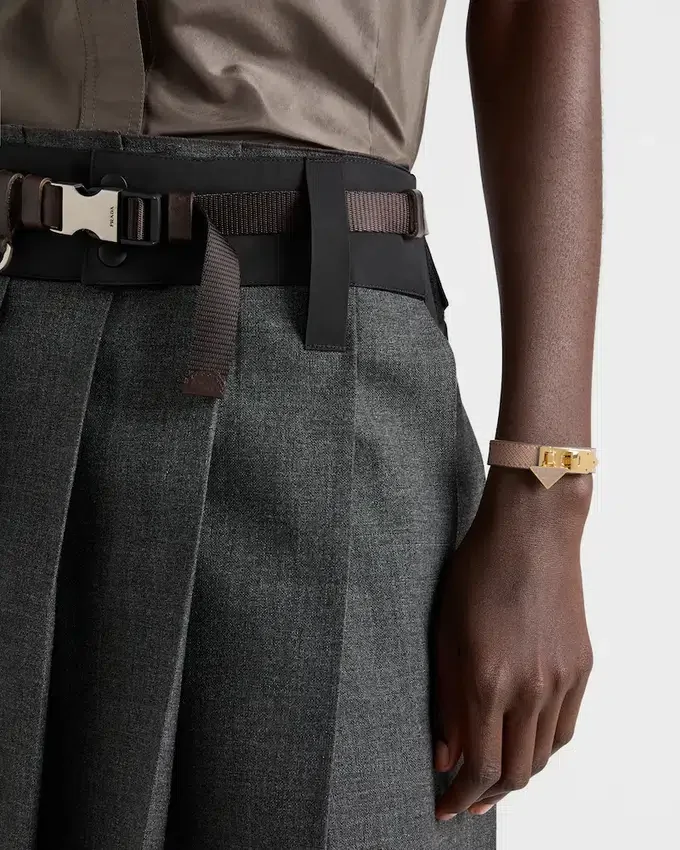 This Elegant Saffiano Leather Bracelet Embellished with a Triangle Logo Charm Stands out for Its Sophisticated, Feminine Design.