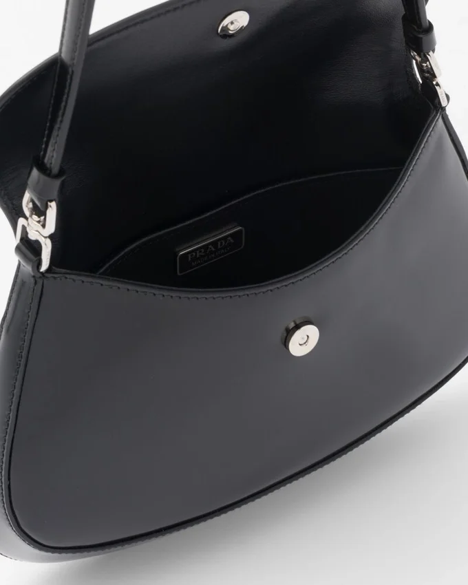 The Prada Cleo Bag with Sophisticated Allure Reinterprets an Iconic Design of the Brand from the 1990’S. Sleek Curved Lines Emphasized by the Particular Construction Rounded on the Bottom and Sides Give This Flap Bag a Soft, Light Look. Brushed Leather, a Modern and Versatile Material That is Distinctive in Prada Collections, is Ideal for Creating Always New Combinations and Contrasts. The Enamel Triangle Logo Decorates the Silhouette.