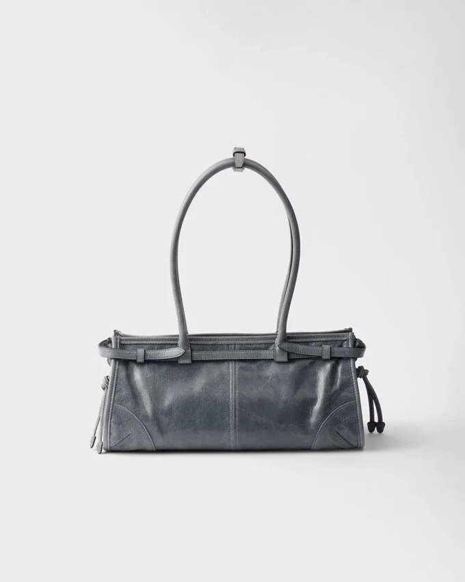 This Pragmatic and Refined Handbag is Made of Soft Leather with a Glossy Finish That Emphasizes Its Versatile, Modern Allure. The Geometric Design Blends Different Influences into One Style with a Distinctive but Sleek Aesthetic. Embellished by the Sophisticated Strap Detail, the Rectangular Silhouette Has Zipper Pockets Inside. The Enameled Metal Triangle Logo Completes the Look with Its Iconic Signature.