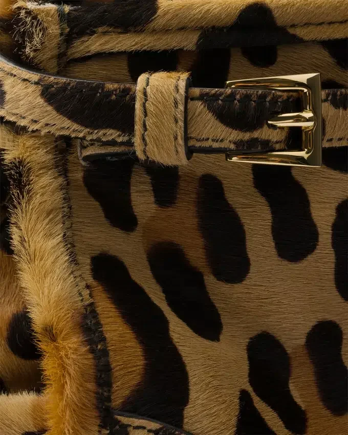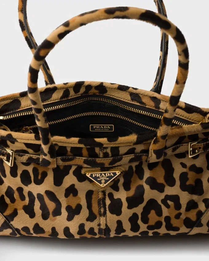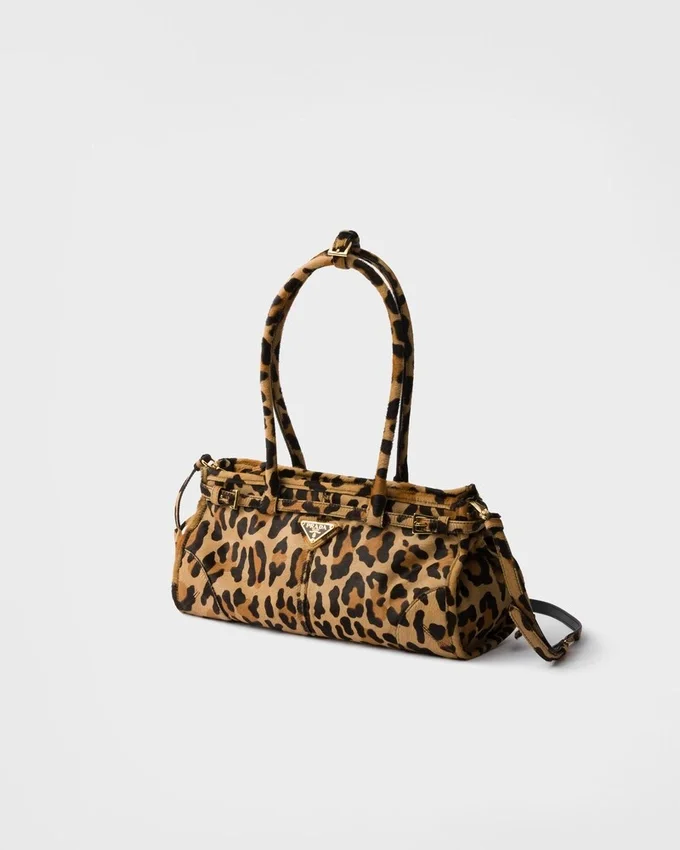 A Blend of Modernity and Tradition Defines This Leather Handbag. The Leopard Print Adds a Bold Accent to the Sophisticated Design, Elevated by the Elegant Gold-Toned Metal Hardware and the Iconic Triangle Logo.