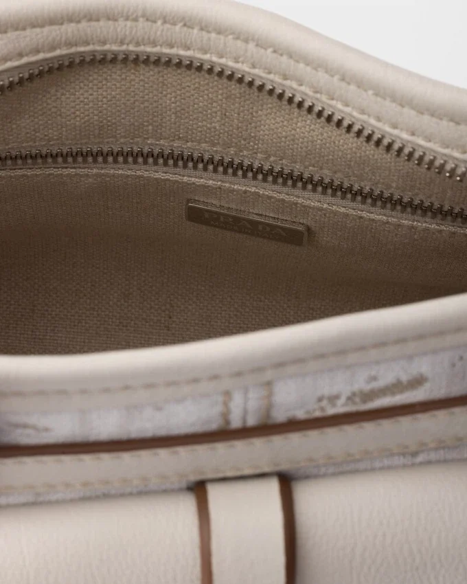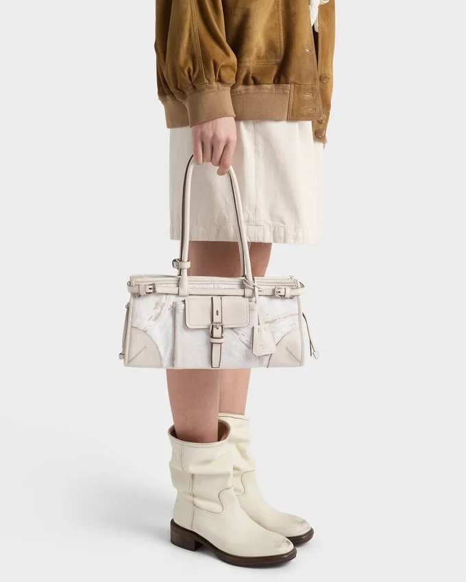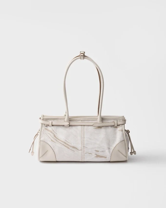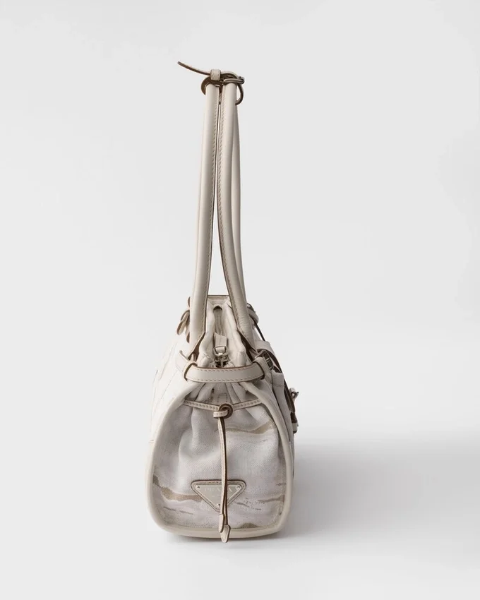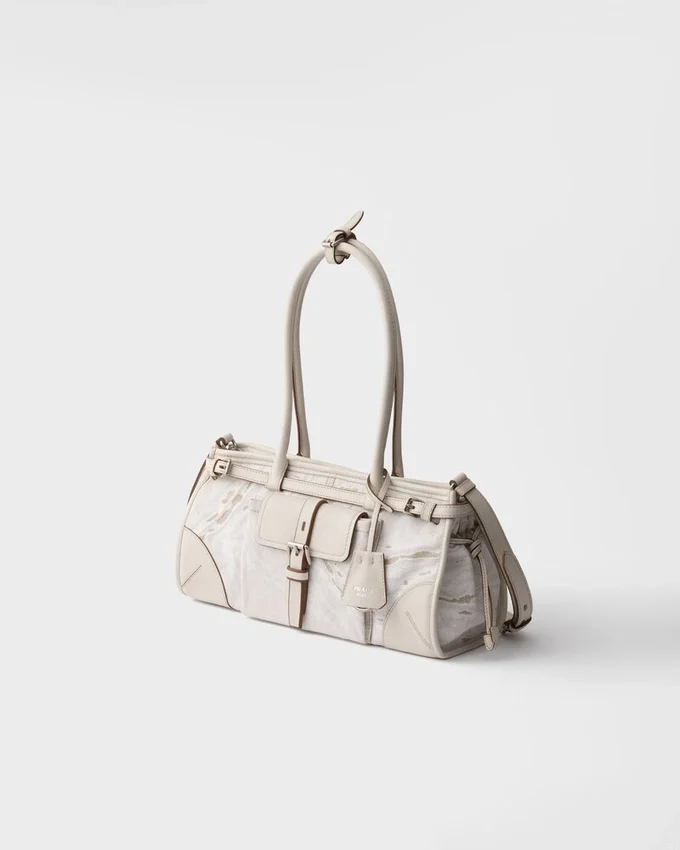 The Medium Version of the Prada Bonnie Bag Reinterprets the Contemporary Elegance of the Accessory in a Refined Combination of Printed Linen and Leather, Where Natural Textures and Structured Details Interact with Balance. The Distinctive and Sophisticated Geometric Silhouette Combines Architectural Rigor and Everyday Functionality. Archive Elements Are Found in the Front Flap Pocket with Strap and Buckle, the Metal Hardware and Side Laces, Iconic References to the Brand’s Historic Language. The Leather Handles and Details Underline the Refined Character of the Design, While the Adjustable and Detachable Shoulder Strap Expands Its Possible Uses, Easily Adapting to Different Occasions.