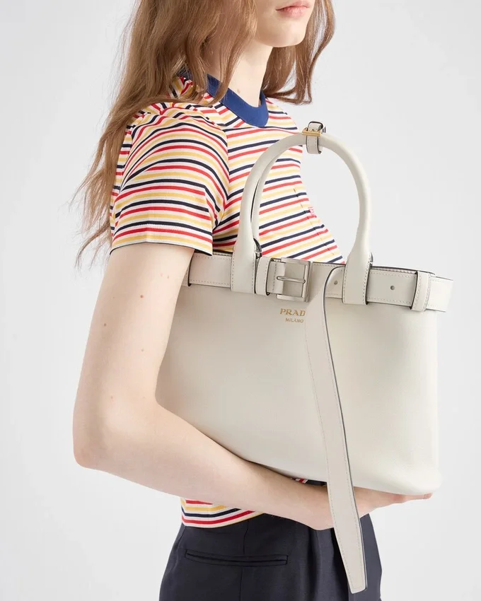 Clean Lines and Refined Elements Tell the Story of Prada’s Dual Aesthetic That Moves Between Simplicity and Detail, Functionality and Elegance. This Leather Bag with Nappa Interior Summarizes the Stylistic Codes of the Brand in a Pragmatic Yet Sophisticated Design. The Silhouette is Characterized by a Multifaceted Soul, Expressed by the Interchangeable Belt That Enriches the Accessory with a Unique and Contemporary Touch. The Lettering Logo, Embossed in 22 Karat Gold Leaf, Decorates the Modern, Versatile Style.