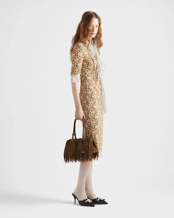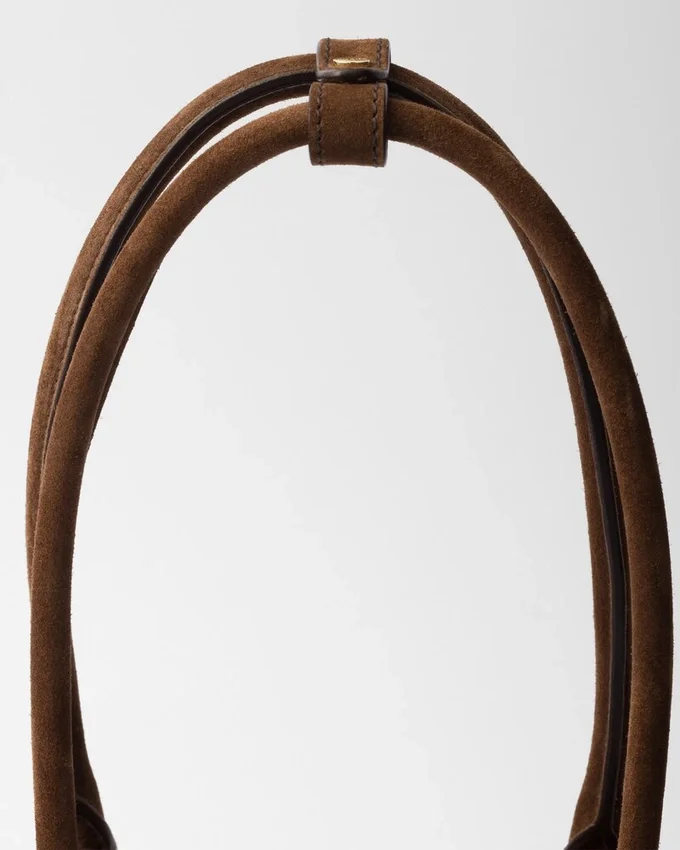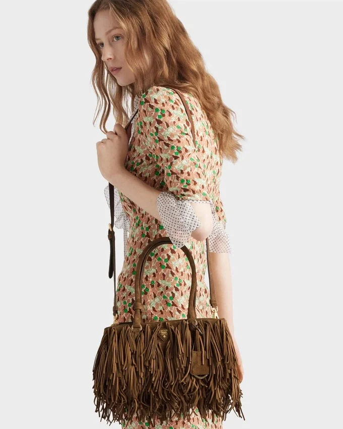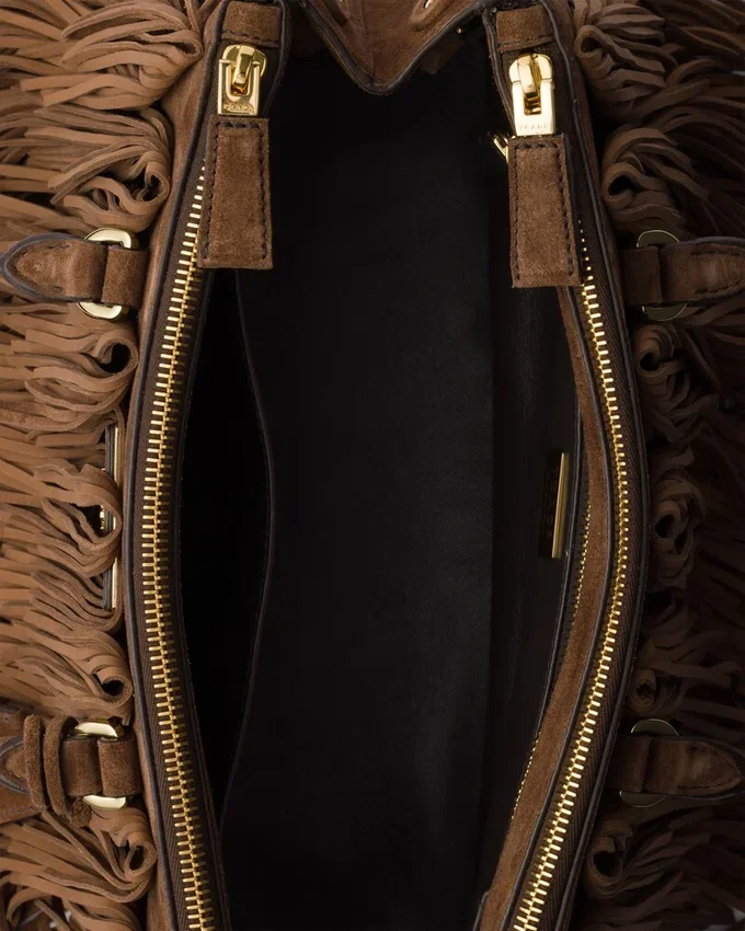 The Prada Galleria Bag with an Elegant, Timeless Design Reflects the Many Facets of the Prada Identity. The Iconic Style Has a New Elongated Silhouette Emphasized by the Suede. Fringe on the Front and Back Completes the Accessory with a Dynamic, Contemporary Note.