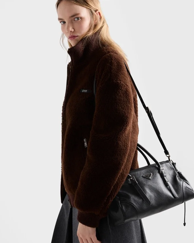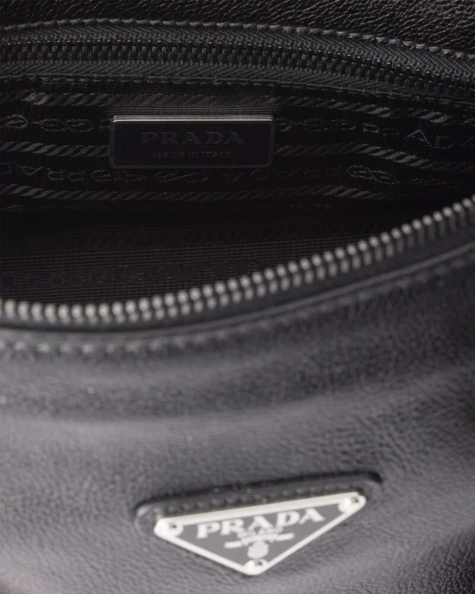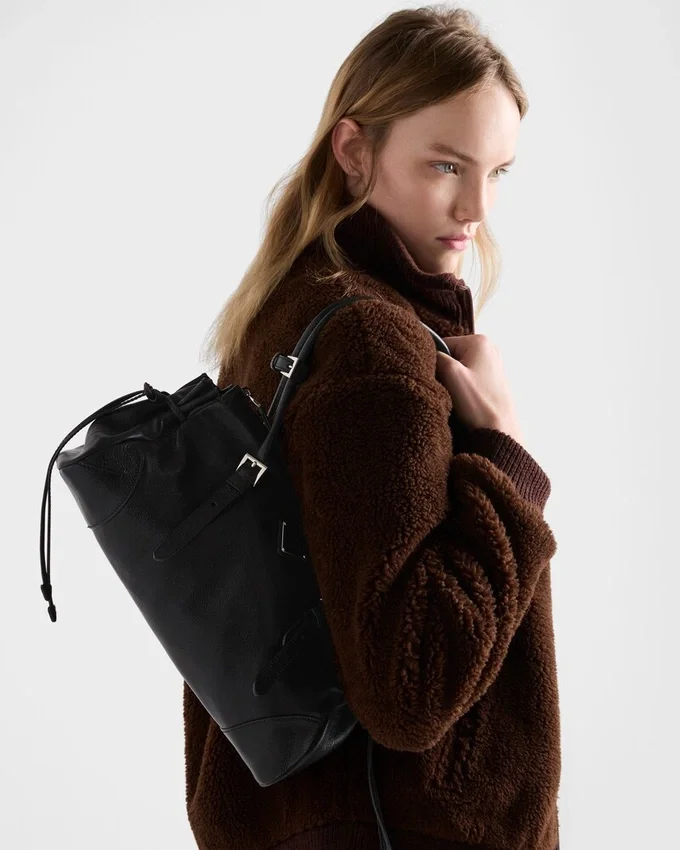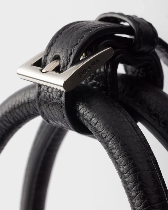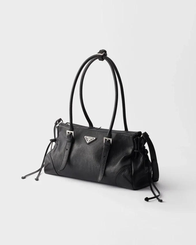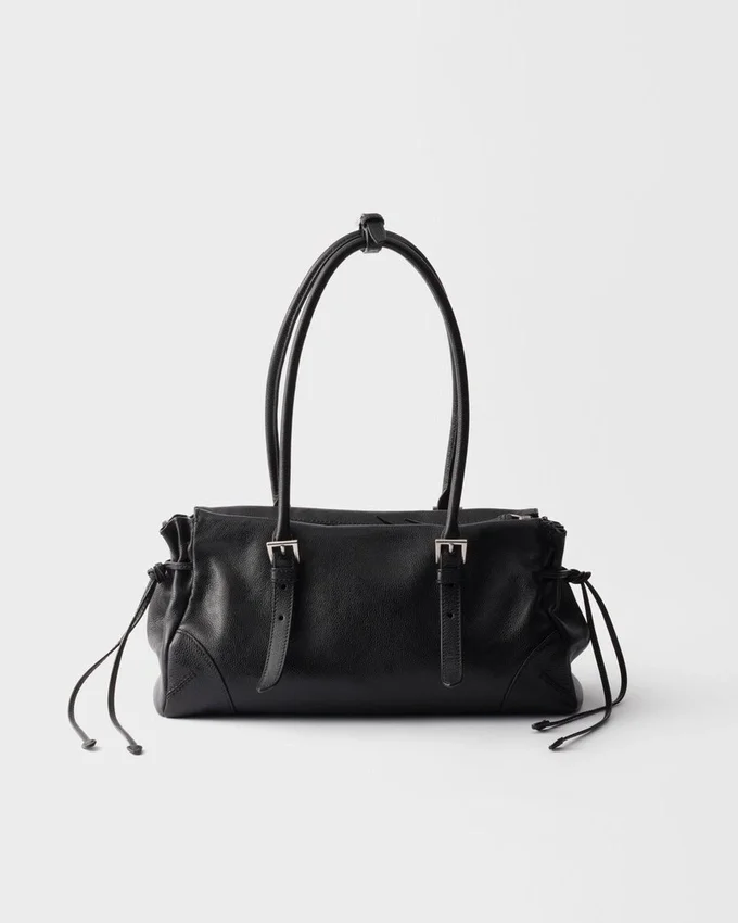 This Leather Bag with an Antiqued Finish Embodies a Sophisticated and Contemporary Personality. The Geometric Silhouette Combines Modernity and Elegance with Archive Details., An Expression of the Constant Dialogue Between Tradition and Innovation. The Metal Buckles and Side Laces Recall Iconic Styles of Past Prada Collections, While the Long Handles Suggest a Pragmatic and Casual Attitude.