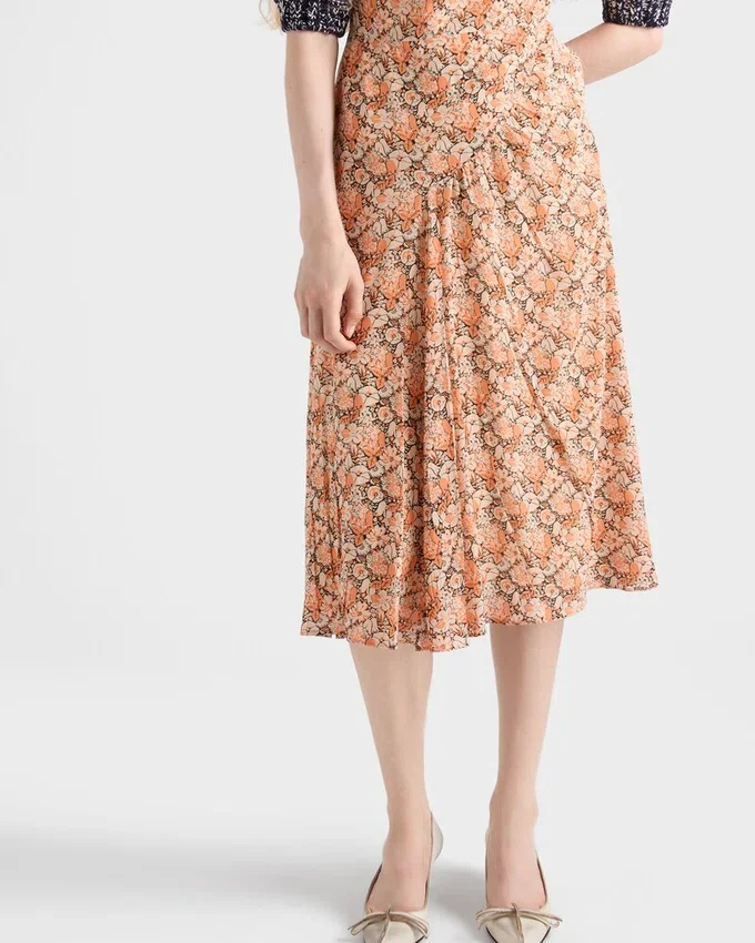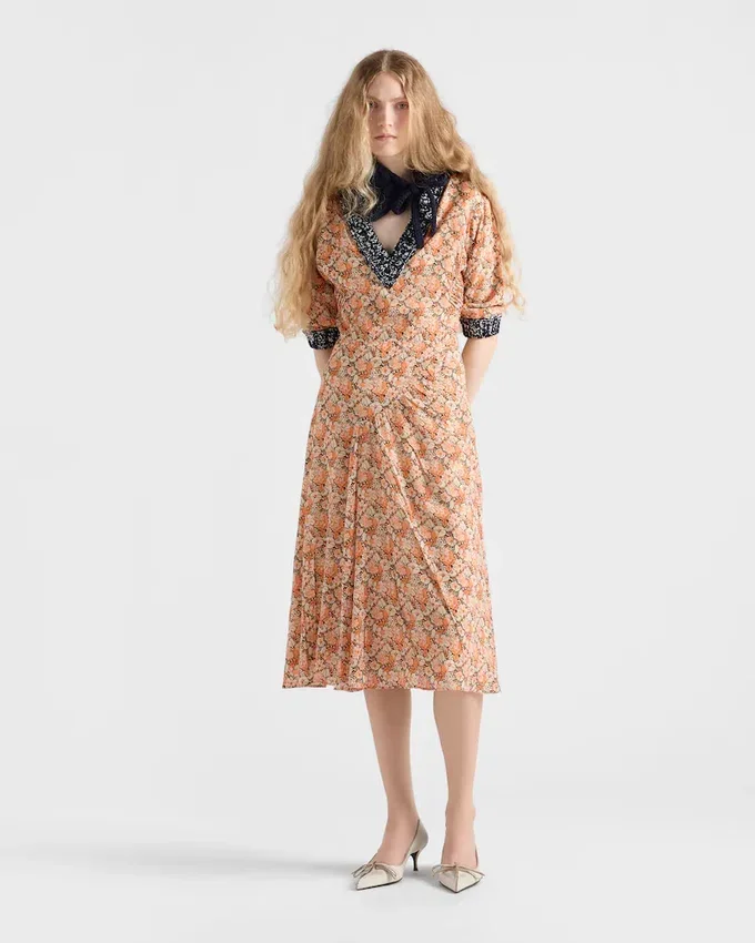 An Archive Print Takes on a New Shape with a Flowing, Flared Silhouette. The Knit Trim on the V-Neck and Sleeves Adds Definition and Movement.