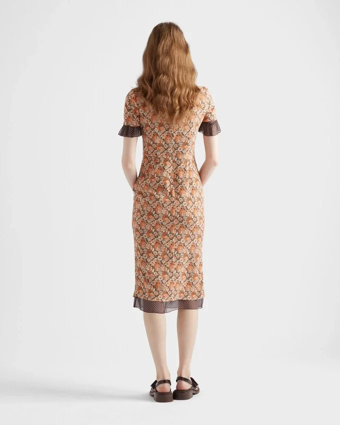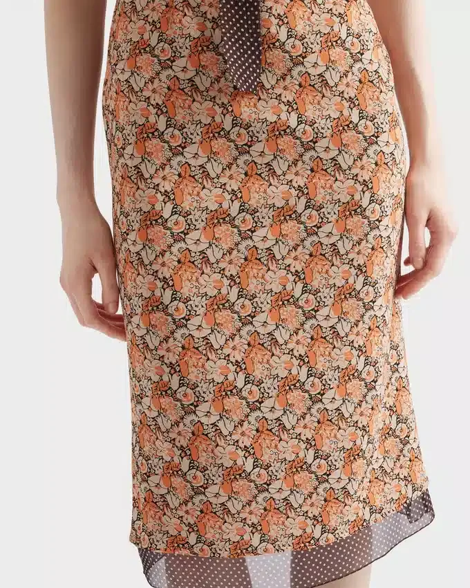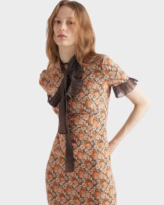 Two Prints with Vintage Allure Animate This Georgette Sheath Dress. The Dress is Characterized by a Floral Motif in Contrast with the Polka-Dot Ruching and Hem That Add a Light, Romantic Touch.