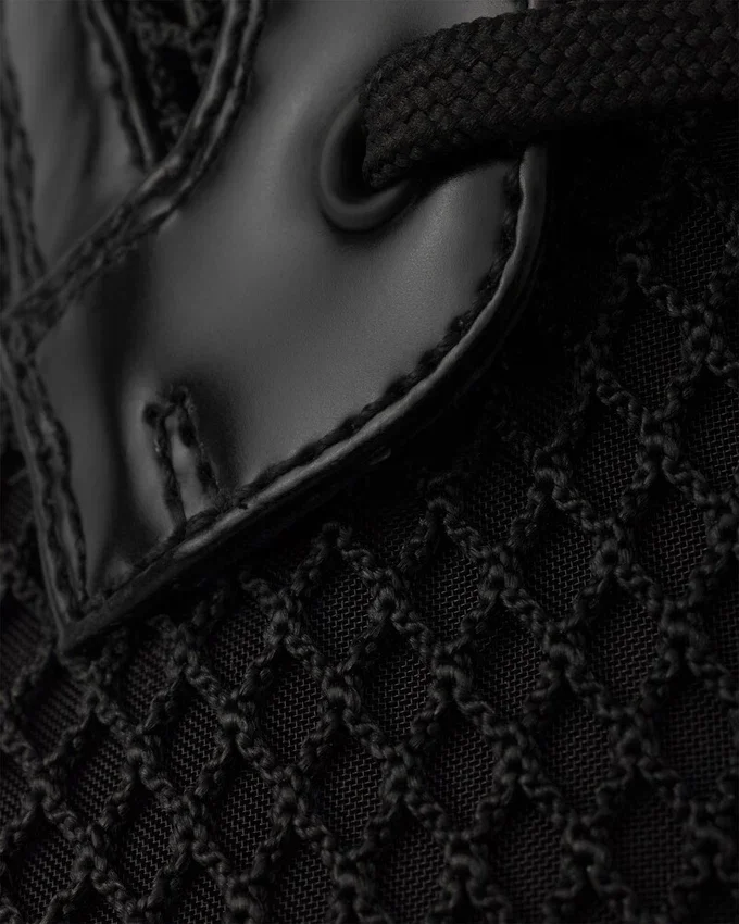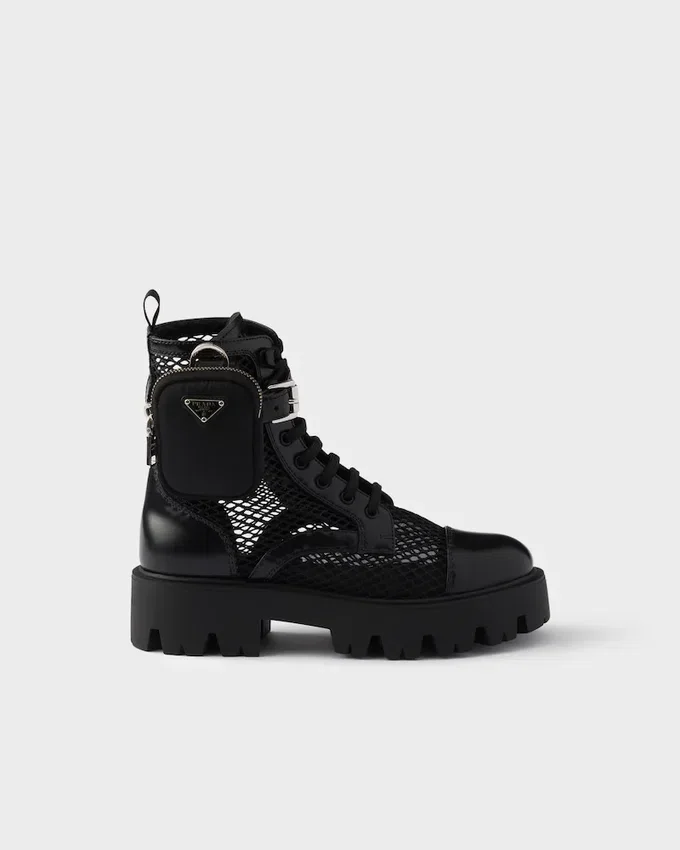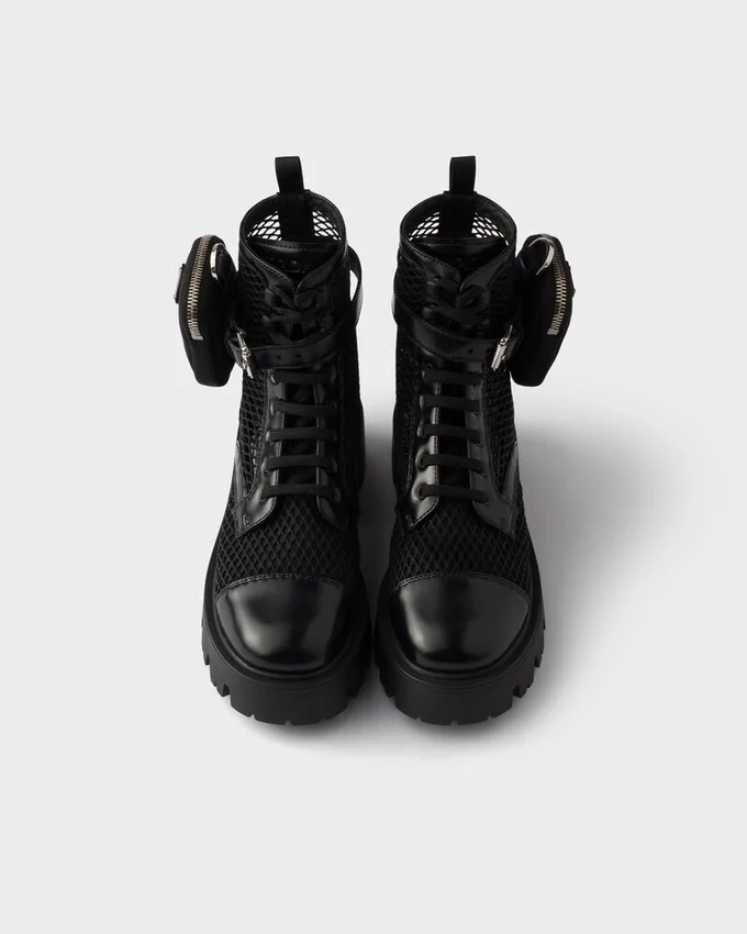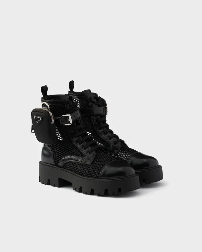 These Booties Embody Prada’s Hybrid Soul in This Version Made of Leather and Mesh, Defined by Oversized Soles with a Unique Design. The Shoe Comes with a Removable Pouch Decorated with the Iconic Enameled Metal Triangle Logo.