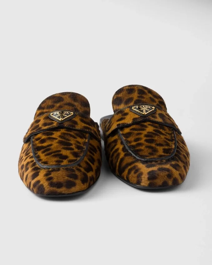 Leopard-Print Leather Gives These Mules a Bold Attitude While the Triangle Logo Adds an Iconic Touch to the Shoe.