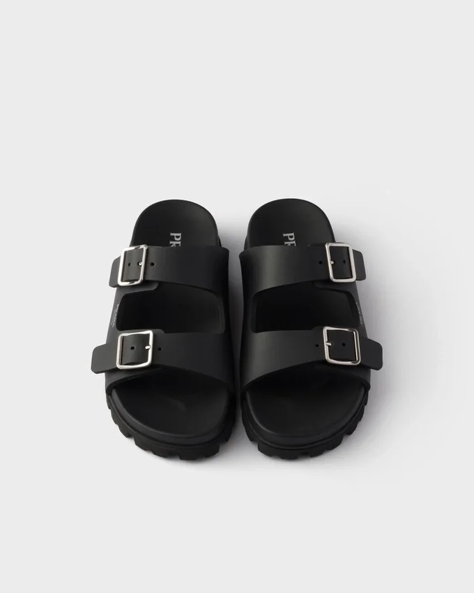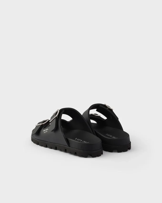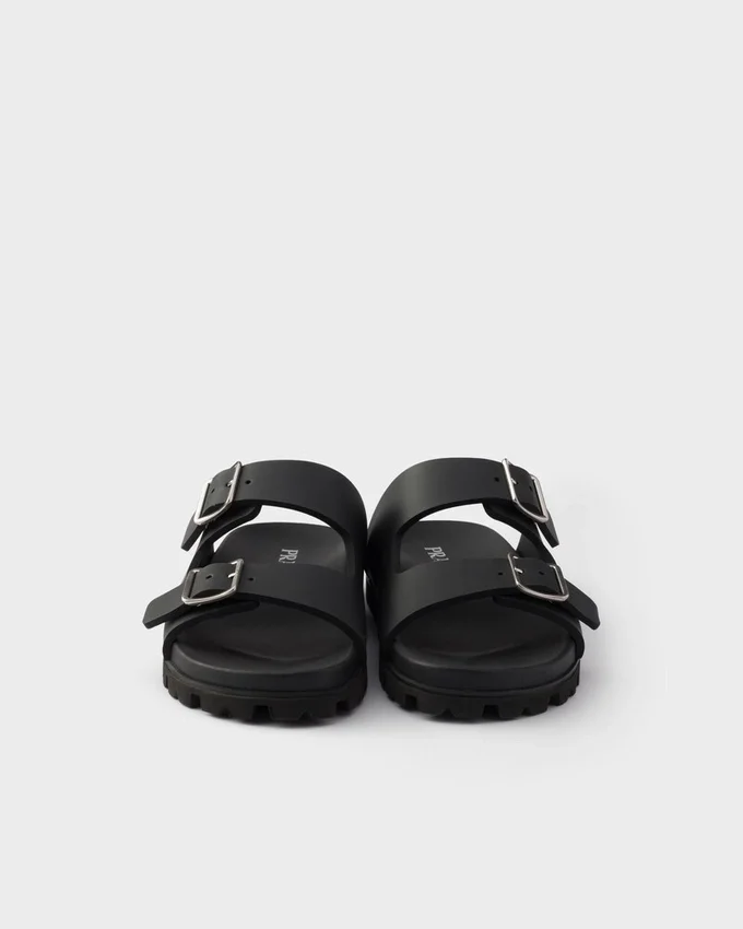 These Slides Combine Comfort with a Sleek, Contemporary Aesthetic. The Flexible and Light Rubber Sandals Are Defined by the Metal Buckles That Complete the Sporty Design.